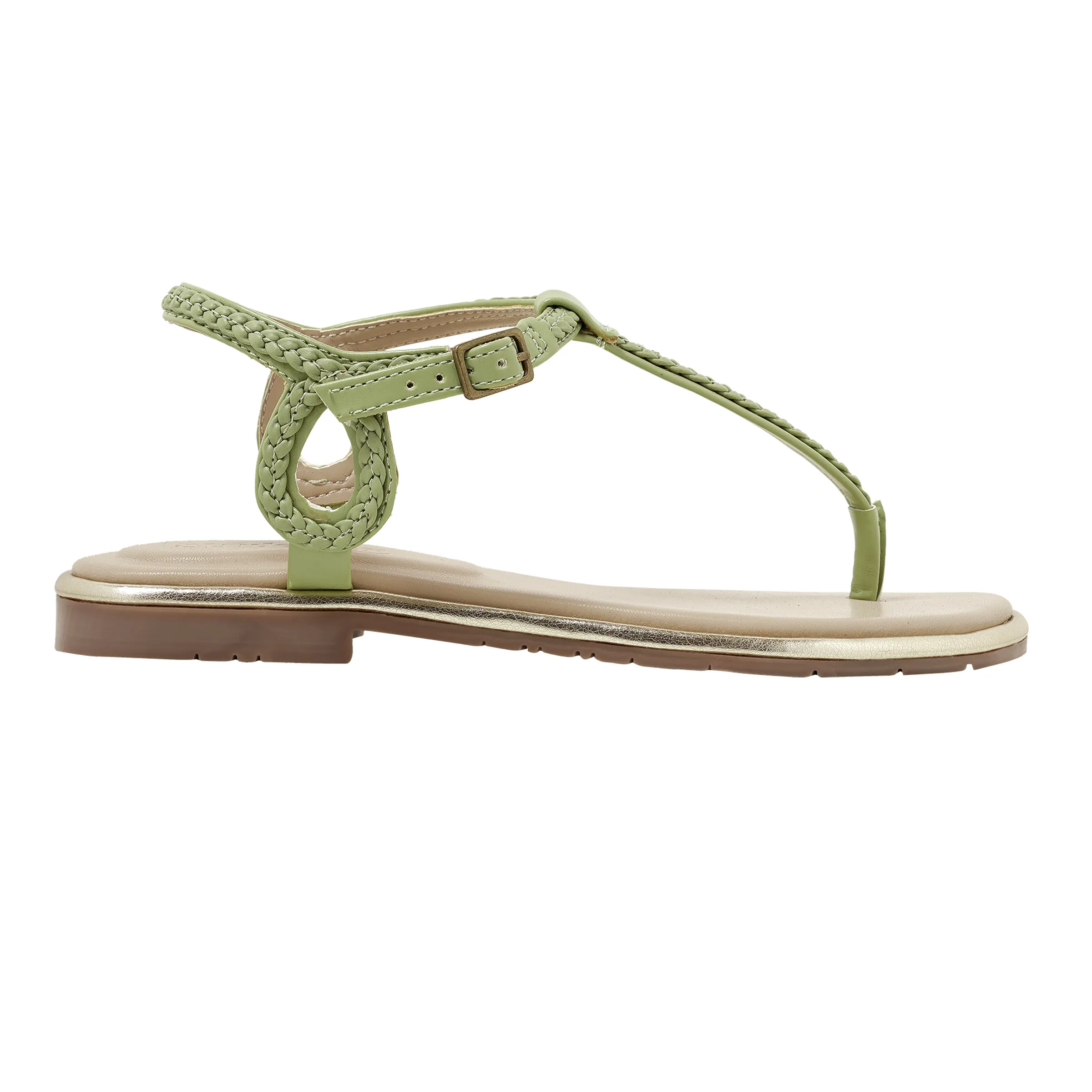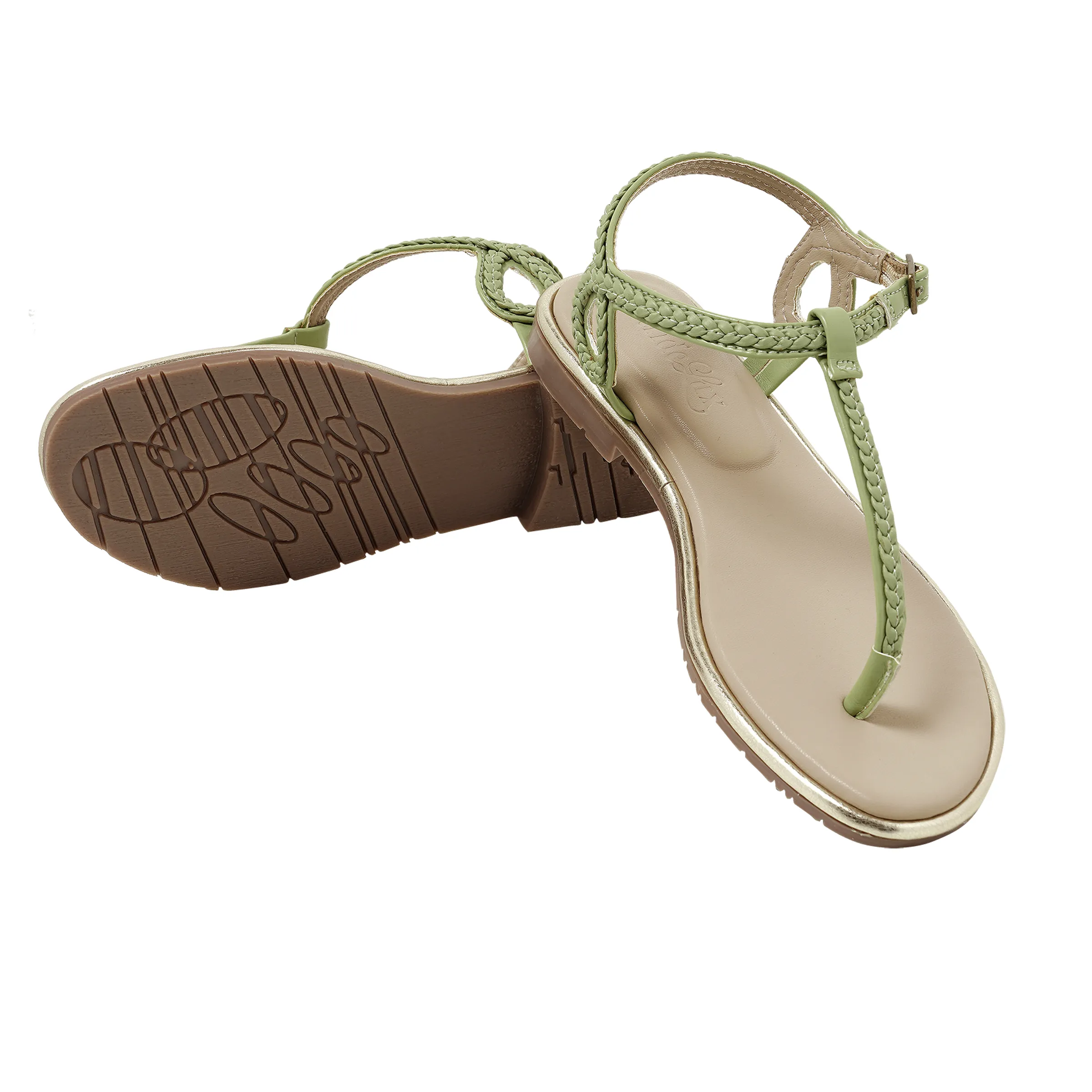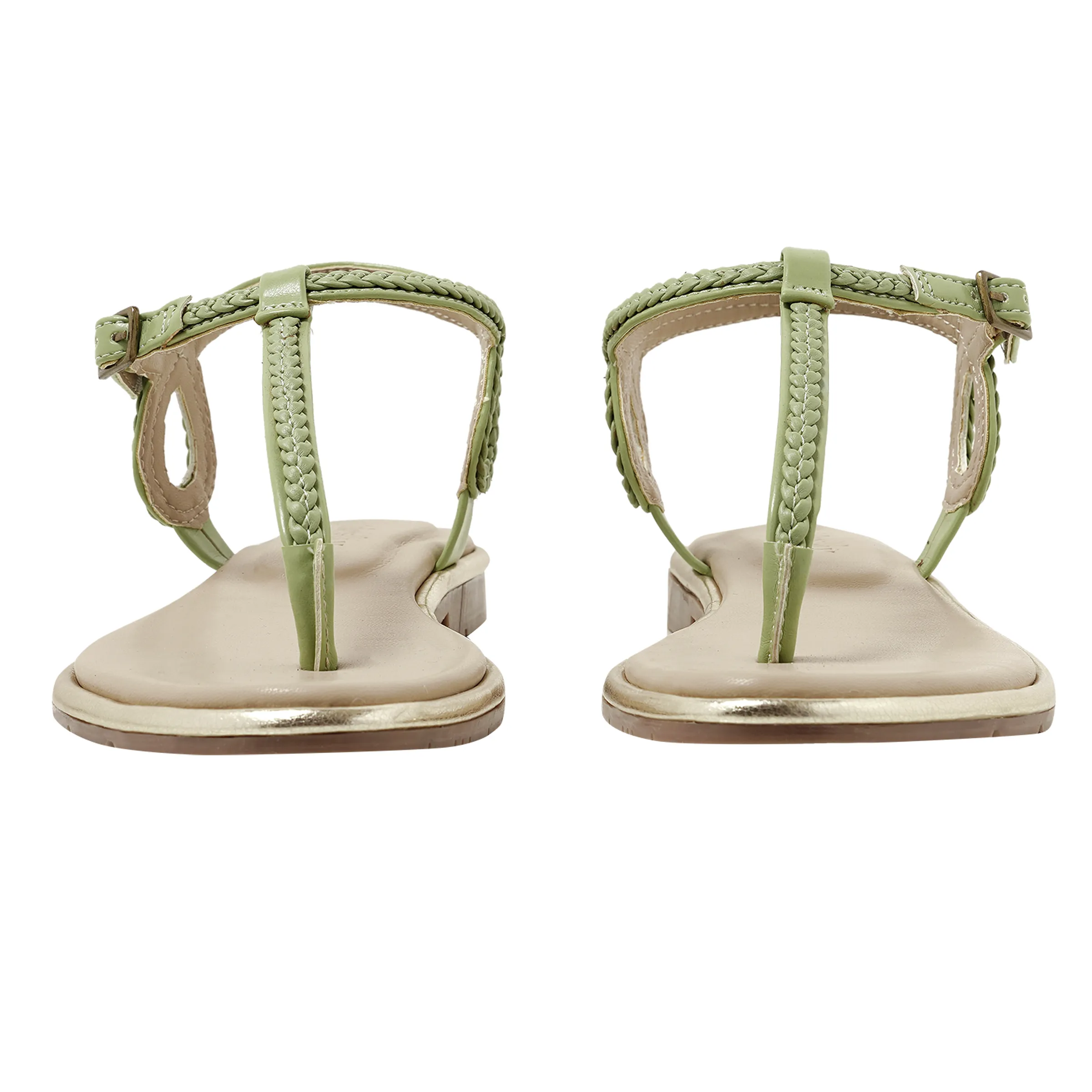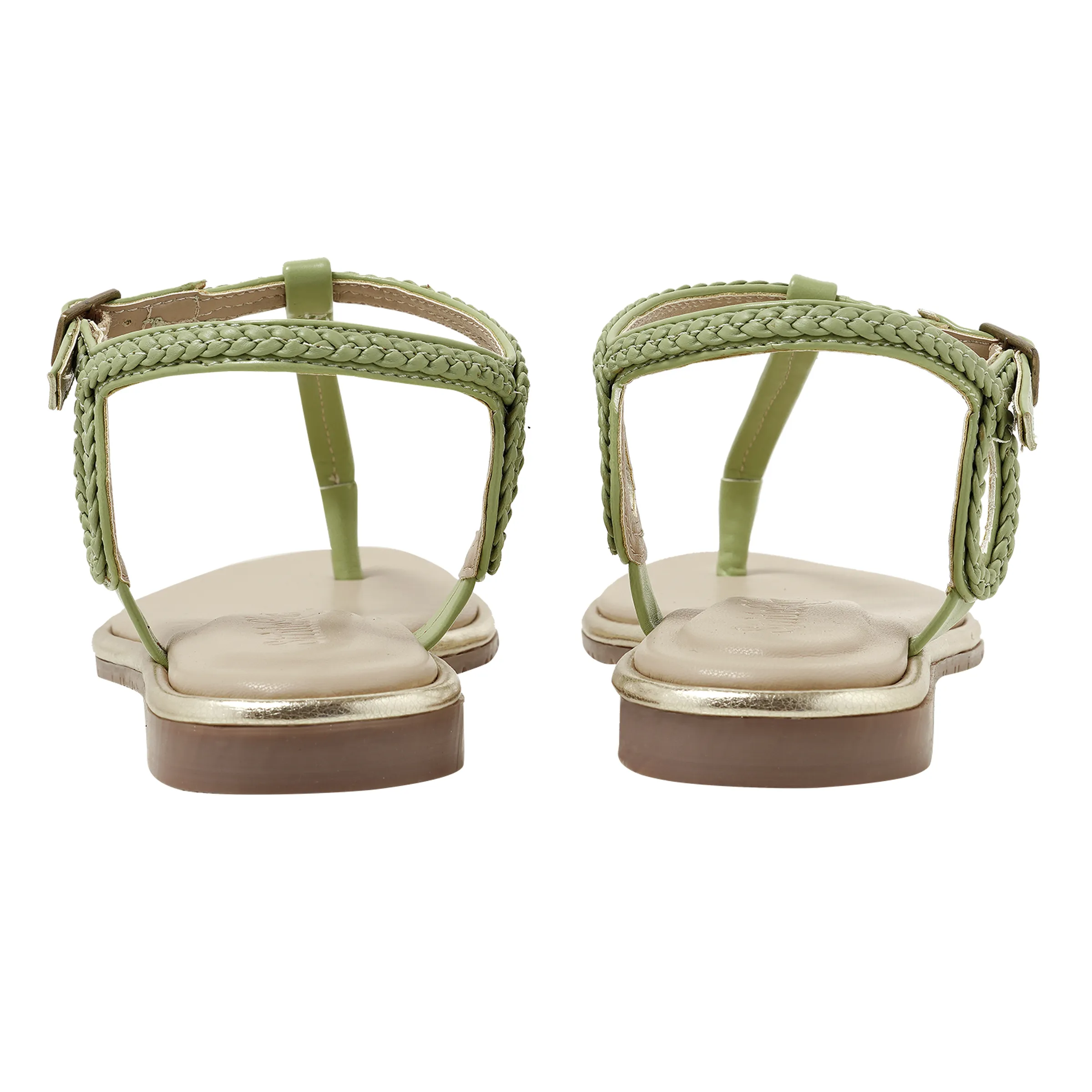 Step into effortless style with our “aquazzura green” flat sandals. These chic sandals feature an elegant T-strap design with beautifully braided details in a fresh light green. A cushioned insole provides all-day comfort, while the adjustable ankle strap with a metallic buckle ensures a secure fit. Finished with a subtle gold trim for a touch of glamour, these sandals are perfect for pairing with everything from summer dresses to casual denim.